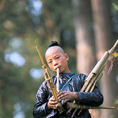 Throughout each sacrifice, musicians “speak” to the ancestors by playing lusheng: huge bamboo flutes whose throbbing notes carry great distances. The largest are over five metres long. A close relation of the family owning the buffalo – usually a young and fit man - brings each animal to the sacrificial area, where it is killed by a family friend with a sword.